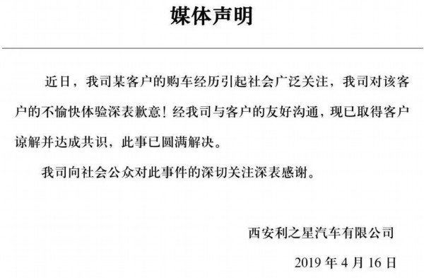 西安利之星汽车有限公司在4月16日深夜对外发布的媒体声明中,对客户的不愉快体验表示歉意。并称,经与客户友好沟通,现已取得客户谅解并达成共识,此事圆满解决。