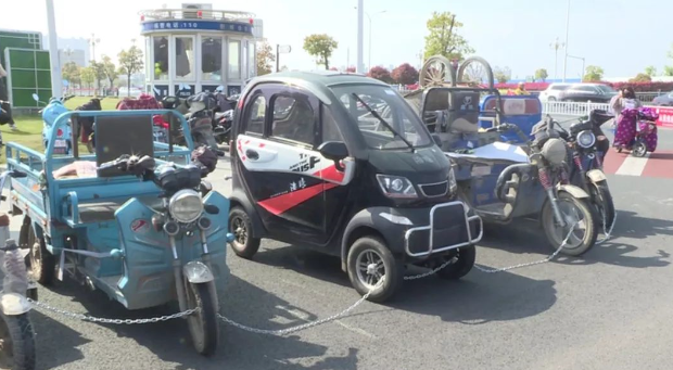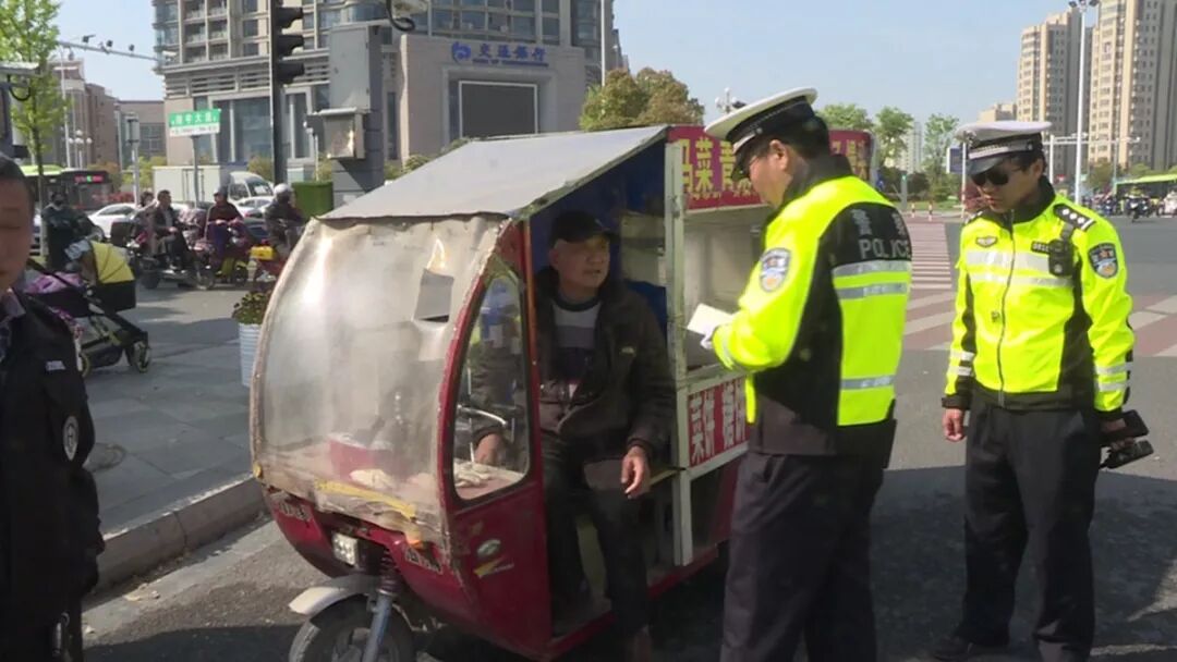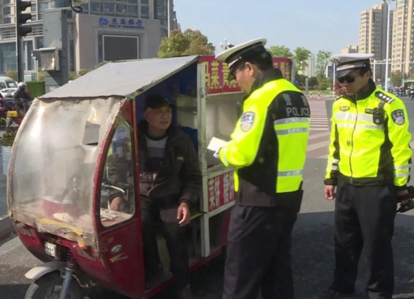 执法现场:未经依法登记的电动三(四)轮车在禁行路线、区域和时间内行驶的,我们将依据市容管理条例处罚100元。