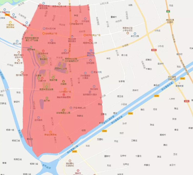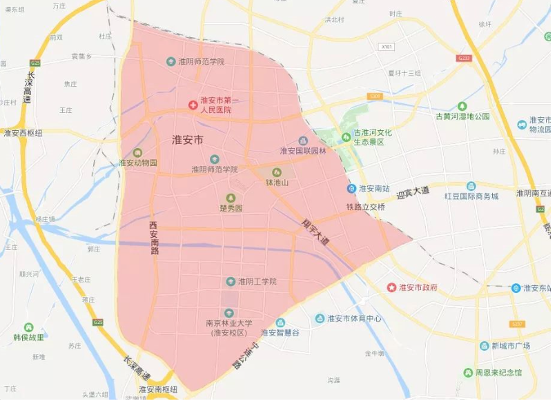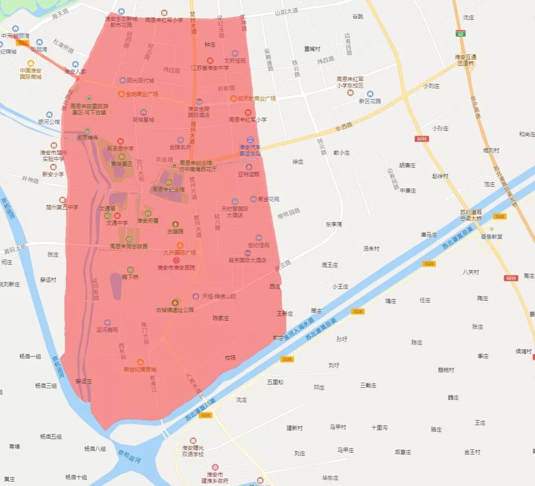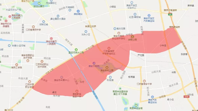 淮安区:淮河入海水道(不含)、沈坤路(含)、山阳大道(含)、城西干道(含)及康马路(含)合围区域及翔宇大道(城西干道至海天路)。