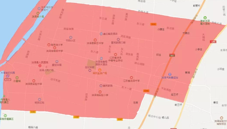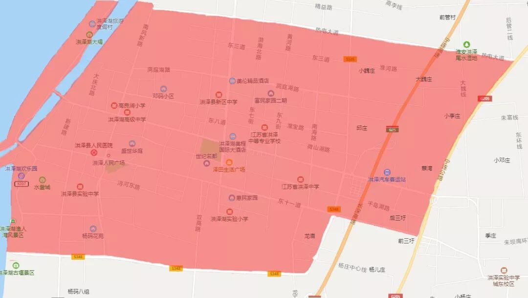 洪泽区:古堰路(含)(原洪泽湖大堤)、205国道(不含)、巢湖路(不含)(原东一道)、348省道(不含)合围区域和348省道、350省道(东至205国道、西至G25高速出口段)。
