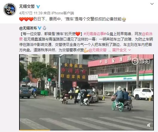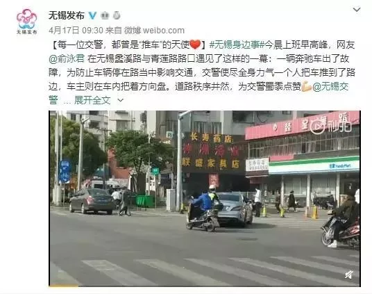 【每一位交警,都曾是“推车”的天使】今晨上班早高峰,网友@俞泳君 在无锡蠡溪路与青莲路路口遇见了这样的一幕:一辆奔驰车出了故障,为防止车辆停在路当中影响交通,交警使尽全身力气一个人把车推到了路边,车主则在车内把着方向盘。道路秩序井然,为交警蜀黍点赞!