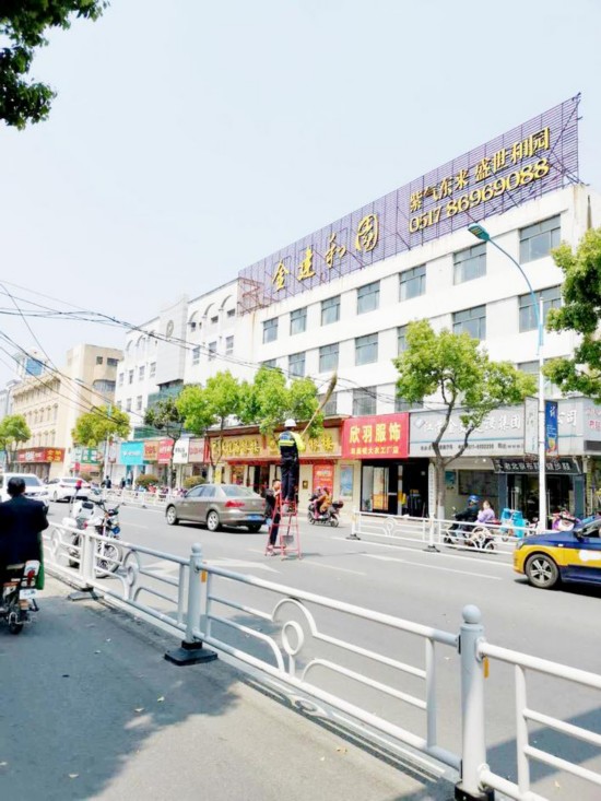 4月17日上午11时左右,在金湖县健康路上,一名辅警站在梯子上用笤帚托举起线缆,确保道路通畅,不少路过市民拍下了这暖心的画面,发到朋友圈,引来数万网友的转发和点赞……