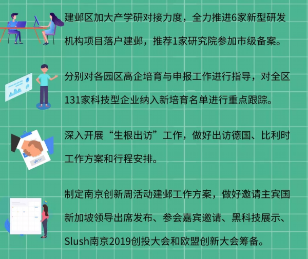 下一步,建邺区将全力推进新型研发机构倍增计划、高新技术企业培育突破计划和全球创新资源集聚计划,为全市打造具有全球影响力的创新名城提供建邺支撑。