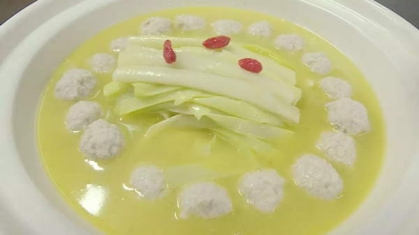 淮安市德为先烤鸭有限公司行政总厨葛久亮说:“在制作蒲菜肉圆时,首先要将蒲菜过油,油温控制在30度左右,蒲菜下锅后要及时地捞出,这样才能锁住水分和营养价值,保证嫩、脆、滑的口感。”