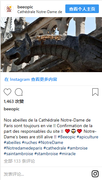 直到法国Beeopic蜂蜜公司在Instagram上发布消息,确认了蜜蜂还活着,并附上了一条信息:“奇迹!巴黎圣母院的蜜蜂还活着!柱子上能听到嗡嗡的声音。”