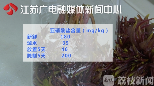 网上有人说香椿头里面有亚硝酸盐,吃多了对人体不好,这是真的吗?检测人员把买来的香椿头分成了四小把,第一把检测人员将在新鲜状态下直接检测,第二把将用开水焯烫一分钟再做检测,第三把和第四把分别自然放置五天以及用盐腌制五天以后再做检测。经过检测,新鲜、焯水、放置五天以及直接腌制五天的香椿头均检出了亚硝酸盐,含量分别为180mg/kg、35mg/kg、 46mg/kg和200mg/kg。焯过水及放置一段时间以后的香椿头亚硝酸盐含量明显减低,新鲜和腌制后的香椿头亚硝酸盐含量则很高。
