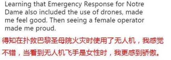 有法国网友还注意到,火灾救援现场照片显示,当时操纵无人机为高压水枪提供灭火策略的,是一位女飞手。