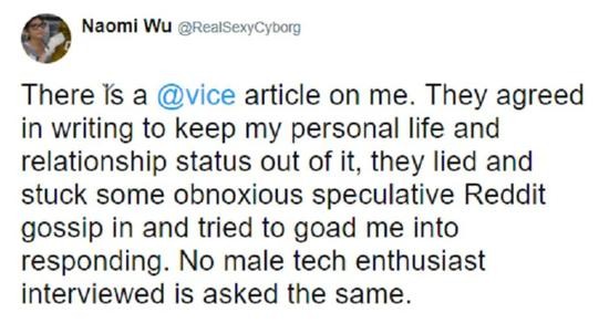 然而Naomi万万没想到的是,满口承诺只谈科技、不泄露私生活的Vice编辑,却在报道时突然变卦,仍然大量曝光了Naomi的生活细节。
