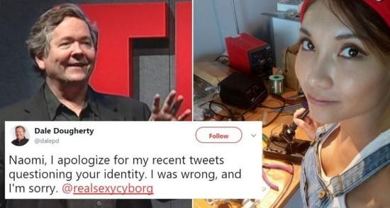 2017年,Naomi遭到了一位非常有影响力的创客——Dale Dougherty(“创客运动的教父”)的质疑和批评,Dale在Twitter上公开质疑Naomi是假的,SexyCyborg频道是一个骗局,这一切都是背后有白人男子在操控。