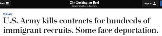 ▲华盛顿邮报:美军废除与上百名被招募移民的合同,有些移民可能被逐出境