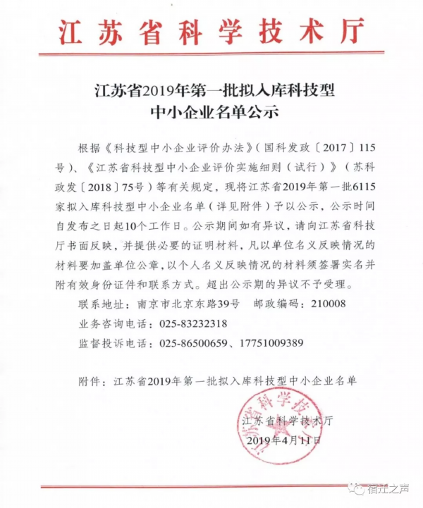 近日,江苏省科技厅公示了2019年第一批拟入库科技型中小企业名单,宿迁这些企业光荣上榜!一起来看看!