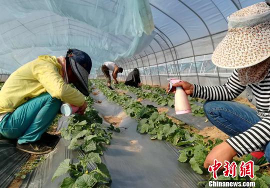 大棚内工人正在给甜瓜苗授粉。 张宁宁 摄