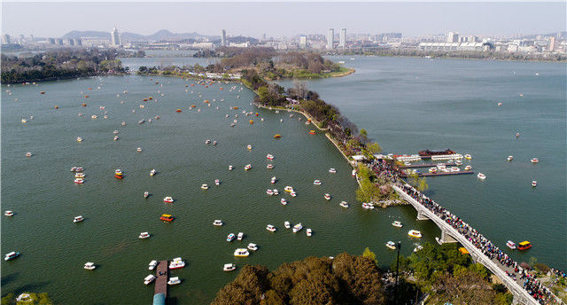 这是2017年3月26日无人机拍摄的南京玄武湖,游船星罗棋布,堤上游人如织。新华社记者 李响 摄