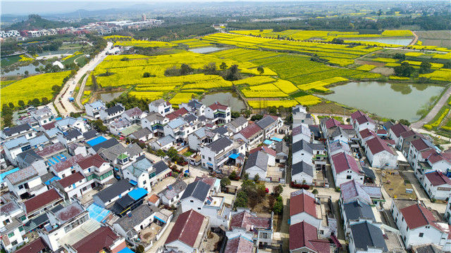 这是在江苏省南京市高淳区桠溪国际慢城拍摄的油菜花田和民居(2017年3月28日无人机拍摄)。新华社记者 李响 摄