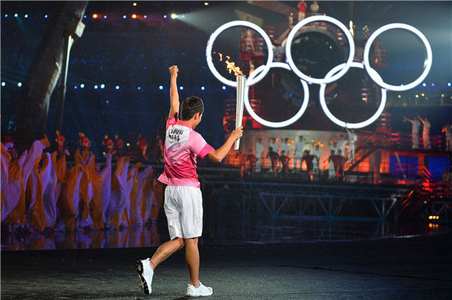 2014年8月16日,第二届夏季青年奥林匹克运动会开幕式在南京奥林匹克中心举行,火炬手、竞走运动员陈定在开幕式上传递圣火。新华社记者 李响 摄