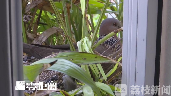 记者在张先生家卧室窗台看到,在一篇绿植丛中,一只大斑鸠正在窝里休息,可能是记者开窗动静大了些,受惊的斑鸠噗嗤飞走了。