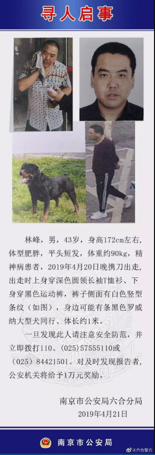 4月21日下午1点多,南京六合警方官方微博发布了一则寻人启事,启事的主角是一名43岁的男子,名叫林峰,他是一名精神病患者,于4月20日晚携刀出走。六合警方为此发布紧急寻人启事,对于及时发现并报告者,公安机关将给予1万元奖励。警方在启事中称,林峰身高172厘米左右,体型肥胖,平头短发,体重约90公斤,是一名精神病患者。4月20日晚,他出走时上身穿深色圆领长袖 T 恤衫,下身穿黑色运动裤,身边可能有条黑色罗威纳型犬同行,体长约1米。一旦发现此人,请注意安全防范,并立即拨打 110、(025)57555110 或(025)84421501。