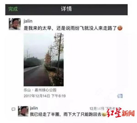 她留下的最后讯息是当日18时19分在朋友圈发布的一张嘉州绿心公园的照片,并称“是我来得太早,还是说雨纷飞就没人来走路了”。4分钟后,其评论留言“我已经走了半圈,雨下大了只能跑回去。”