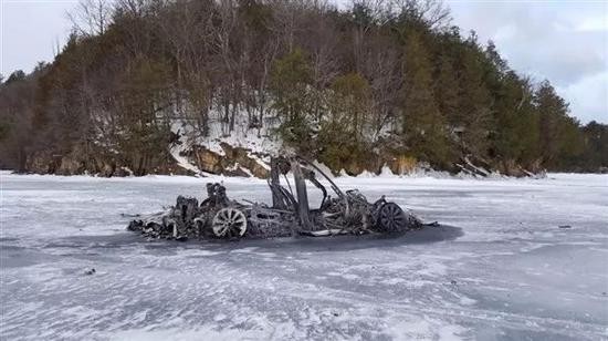 同月,一位来自美国佛蒙特州的特斯拉Model 3车主GreenMtnM3(特斯拉论坛ID)拍到一台在冰面上烧到仅剩车架的Model X SUV。