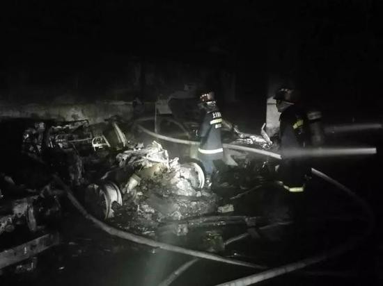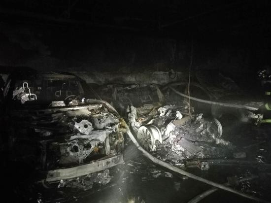 这起火灾还殃及了附近车辆,现场照片显示至少有两辆车的车头部位,在火灾中被烧得几乎只剩骨架。