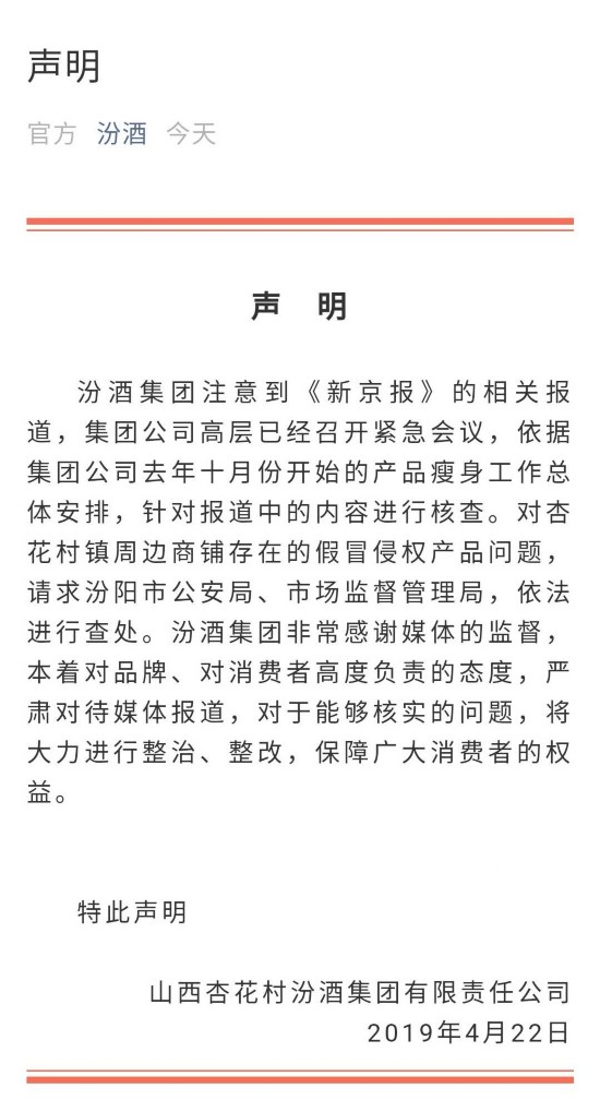 对此,汾酒集团今日在官方微信上发布《声明》称,已注意到《新京报》的相关报道,集团公司高层已经召开紧急会议,依据集团公司去年十月份开始的产品瘦身工作总体安排,针对报道中的内容进行核查。对杏花村镇周边商铺存在的假冒侵权产品问题,请求汾阳市公安局、市场监督管理局,依法进行查处。汾酒集团将对于能够核实的问题进行整治、整改。
