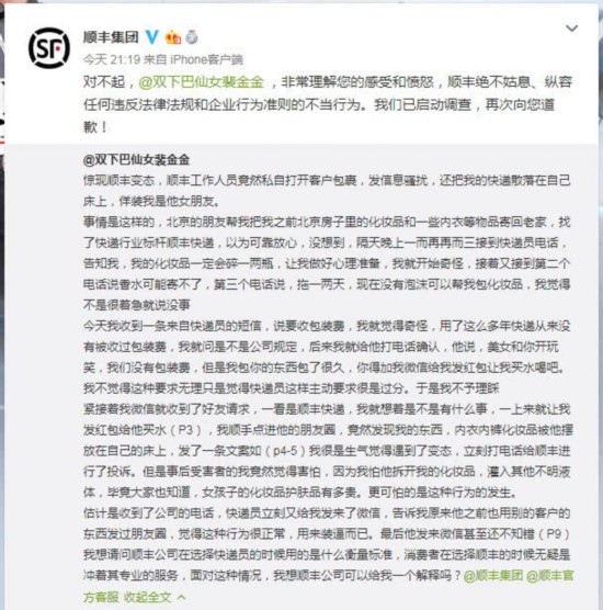 据微博网友@双下巴仙女裴金金 发文称,惊现顺丰变态,顺丰工作人员竟然私自打开客户包裹,发信息骚扰,还把我的快递散落在自己床上,佯装我是他女朋友。