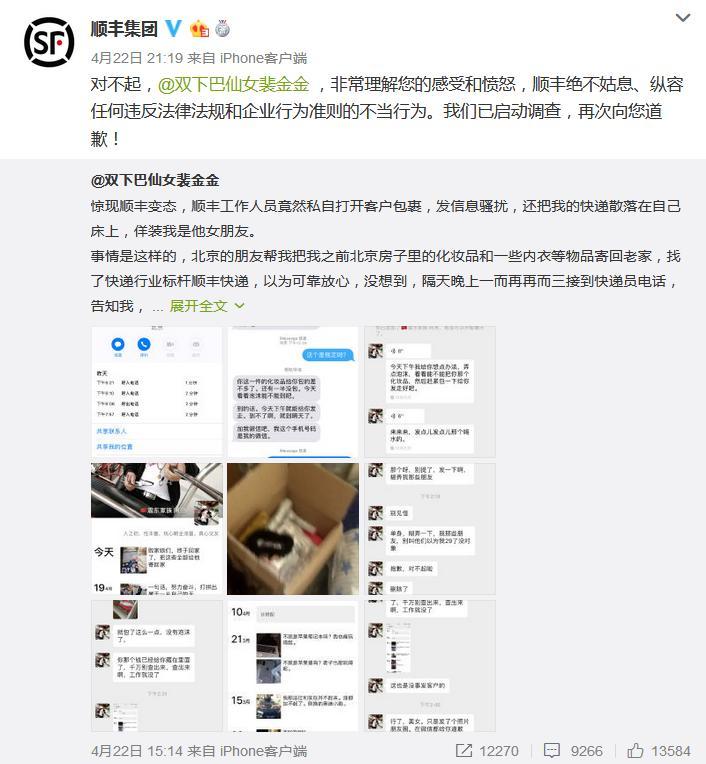 22日晚间,有微博用户发消息称顺丰快递员私自打开其包裹,并将东西散落在床上进行拍照。对此,顺丰官方微博同日晚间向该客户致歉,表示绝不姑息、纵容任何违反法律法规和企业行为准则的不当行为,现已启动调查。