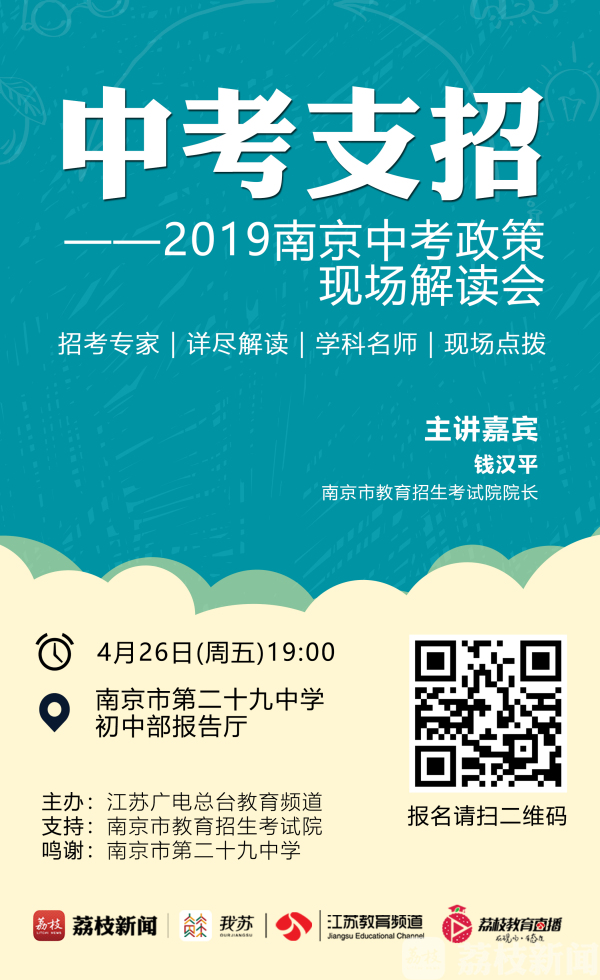 为让广大考生及家长更全面地掌握南京市中考招生政策的具体实施细则,江苏广电总台教育频道联合荔枝新闻,特邀南京市教育招生考试院,联合打造“中考支招——2019南京中考政策现场解读会”, 为考生及家长答疑解惑。