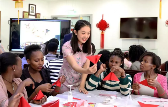 ↑在肯尼亚内罗毕,一名中国志愿者向内罗毕大学孔子学院的学生教授剪纸。新华社记者王腾摄