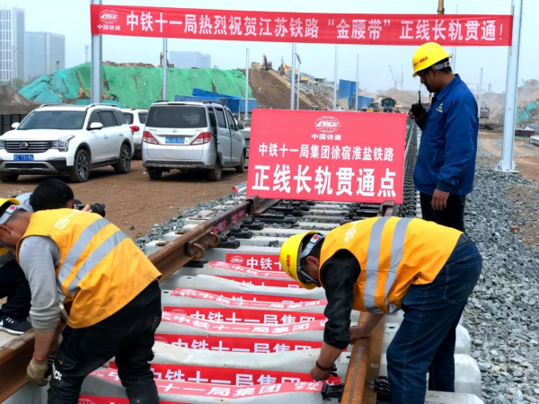 上午11时39分,徐宿淮盐铁路正线最后一对500米长轨在徐州铺设完成,标志着历时7个多月施工作业的徐宿淮盐铁路正线长轨贯通,预计年底具备通车运营条件。