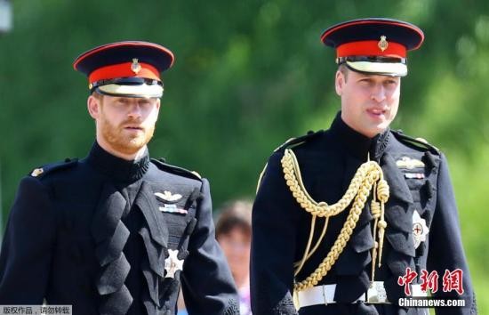 资料图:当地时间5月19日,英国哈里王子与美国女星梅根·马克尔在英国温莎城堡举办婚礼。当天中午,新郎哈里王子与伴郎威廉王子(右)出现在温莎城堡前,两人穿上了军礼服。