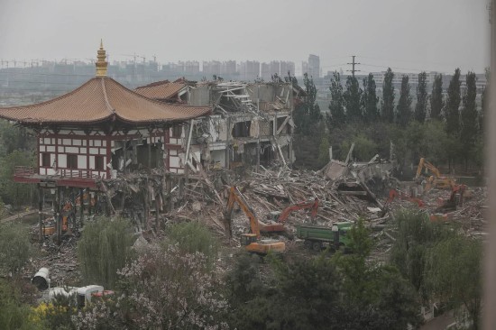新京报讯 直销巨头天津天狮集团豪华宫殿式建筑“华堂”一事有新进展。4月23日晚,天津市武清区人民政府官方微博通报称,天狮集团已开始自行组织拆除“华堂”建筑。今日(24日),新京报记者回访发现,华堂主体建筑长寿殿屋顶已基本被拆除。