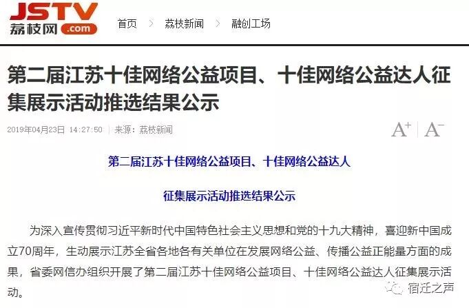 为深入宣传贯彻习近平新时代中国特色社会主义思想和党的十九大精神,喜迎新中国成立70周年,生动展示江苏全省各地各有关单位在发展网络公益、传播公益正能量方面的成果,省委网信办组织开展了第二届江苏十佳网络公益项目、十佳网络公益达人征集展示活动。
