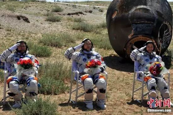 神九载人飞船返回舱在内蒙古主着陆场安全着陆,航天员景海鹏、刘旺、刘洋出舱后敬礼。 中新社发 李靖 摄