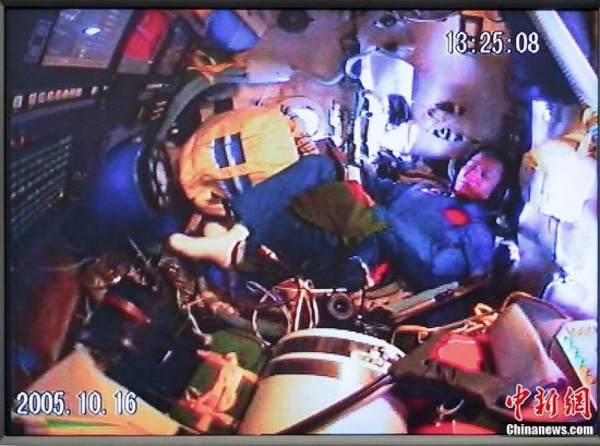 “神舟六号”航天员在记录飞行笔记。 中新社发 齐彬 摄