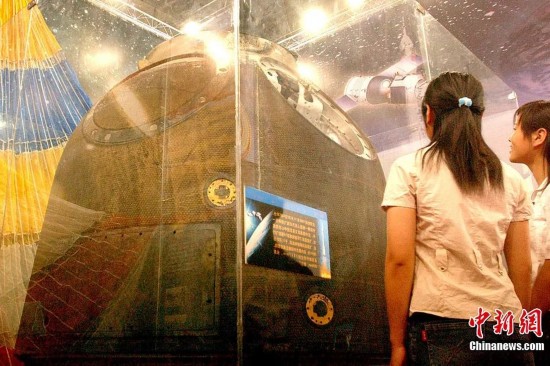 资料图: 2005年5月27日,两个女孩在河南科技馆观看“神舟一号”飞船。 中新社发 慎重 摄