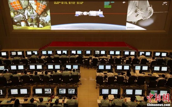资料图: 2013年6月13日13时18分,天宫一号目标飞行器与神舟十号飞船成功实现自动交会对接。 图为北京航天飞行控制中心指挥大厅大屏幕播出对接实时画面。 中新社发 孙阳 摄
