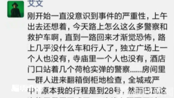 返回酒店的路上,艾文发现路上的行人和车辆越来越少,主要路口都有军队把守。多辆装甲车、防暴车、救护车从她身旁经过,警笛声在耳边响彻,经过的车辆和人员都要接受检查。