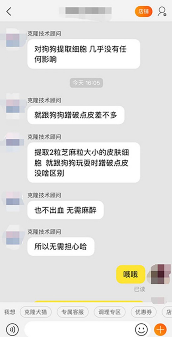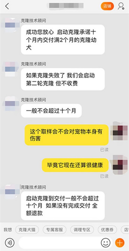 北青报记者随机选取了一家声称可做宠物克隆的网店进行咨询,网店的克隆顾问介绍,宠物克隆是一家位于北京的生物实验室进行,宠物克隆细胞可在活体动物和已死亡的动物中进行。如动物死亡,需用湿毛巾包裹并保存在2-8摄氏度的冰箱中。并联系实验室的技术人员上门取样。