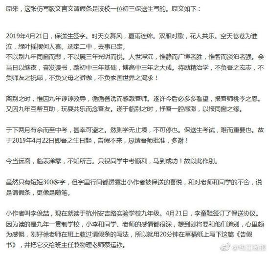 前天,杭州安吉路实验学校九年级语文老师徐晖收到一张请假条,通篇都是文言文,徐老师被感染了,在朋友圈留言:“今保送已定,一生临别,即兴手作《告假书》,读之甚妙。奇文共赏之。”