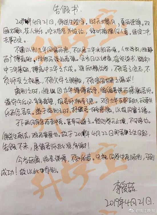 原来,这张仿写版文言文请假条是该校初三保送生李俊喆写的。虽然只有短短300多字,但字里行间都透露出小作者被保送的喜悦,和对老师和同学的不舍,说是请假条,更像是随笔。