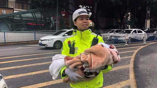 紫牛新闻日前找到当事女警,她是重庆市公安局渝中区分局交巡警支队六大队的肖伟,她怀里的孩子是一位路人路先生的。当时路先生开车载着妻儿去医院,行车途中妻子突然大出血,手足无措之时,他找到了素不相识的女交警肖伟,帮忙照看还在襁褓中的孩子。