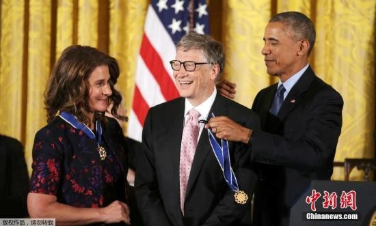 资料图:当地时间2016年11月22日,美国总统奥巴马在白宫为比尔·盖茨夫妇颁发总统自由勋章。