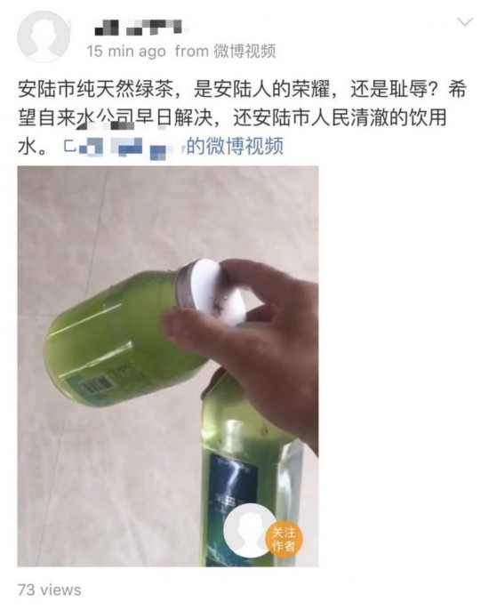近日,多名湖北省安陆市网友发帖称,安陆市区部分居民家中的自来水变成了绿色,一名网友发布的视频展示了家中24日晚接的水,可以看到水呈现出明显的绿色。有市民调侃说自家水龙头直接能倒出“绿茶”来。此外,有居民称这些绿色的自来水带着一股浓烈的鱼腥味,并称这种情况已经持续了4、5天,担心这样的水是否会对人身体有危害。