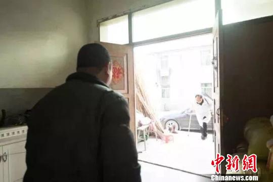 图为史伟兵拄着双拐去村民家中诊疗。诸暨市卫健局供图