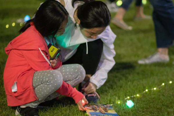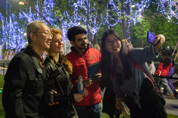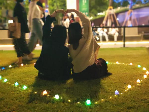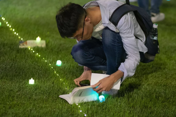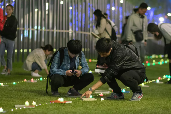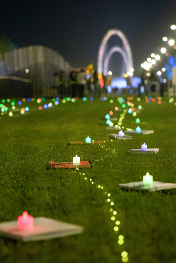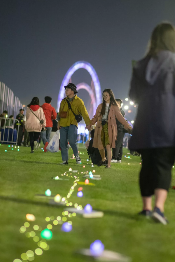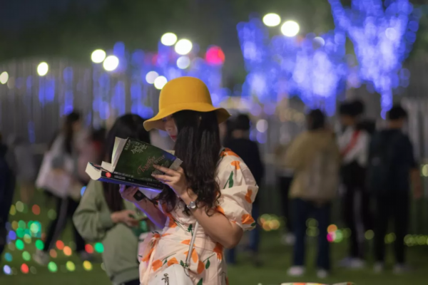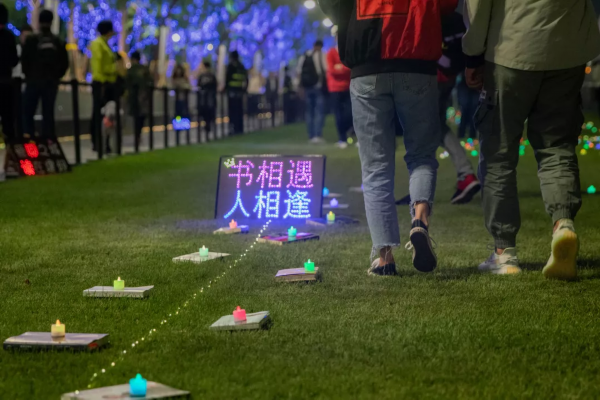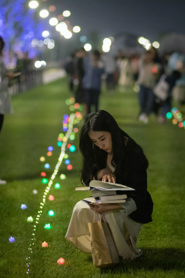 一本本图书放置于广场上,一盏盏电子蜡烛夜空中散发出点点光芒,青奥轴线星光点点,整个广场顿时变成“萤火虫的世界”。