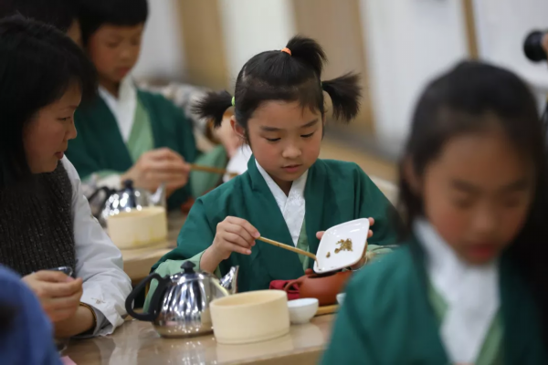 汲水、洗盏、烫杯、礼茶……在建邺书房分会场,也同步进行着“建邺小茶人的文化之旅”活动,从阅读茶诗开始,让孩子们切身感受中华传统文化之美。