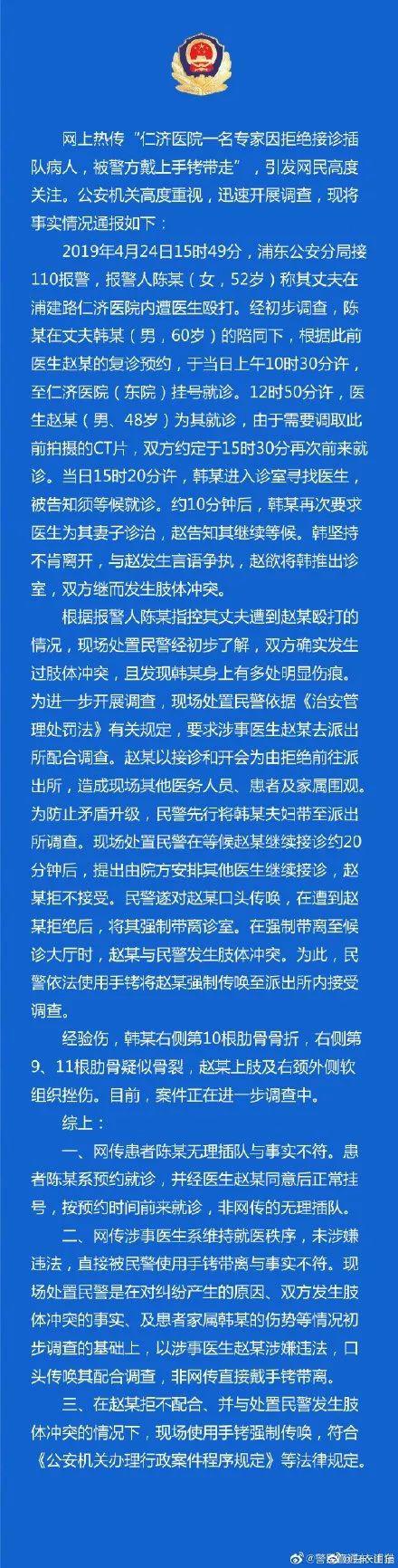 4月24日,上海仁济医院胸外科主任医师赵晓菁被警方铐走,现场视频在网络上广泛流传。赵晓菁在接诊过程中,因患者家属多次插队而与患者一方发生纠纷。相关视频显示,在警方到达医院后,医务人员也与民警产生了冲突。
