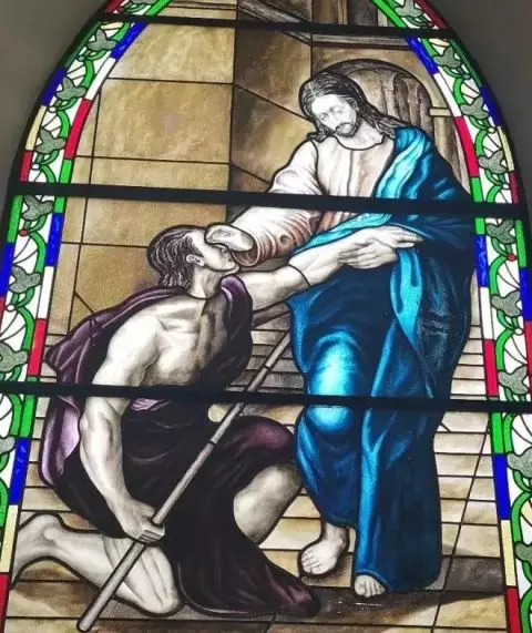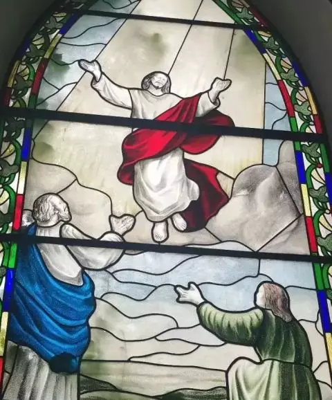 站在曹家镇小德肋撒堂前,正门上方,钟楼二层,便是三扇大玻璃花窗。