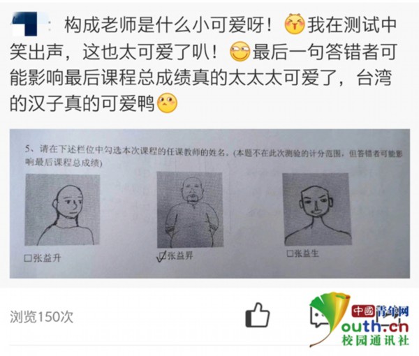 据了解,这道题是由该校风景园林学院学院教师张益昇所出,这道看图识师题的题目括号里写着,“本题不在此次测验的计分范围,但答错者可能影响最后课程总成绩。”再往下看,三幅人物简笔图则分别配有“张益升”、“张益昇”、“张益生”三个姓名,从三个选项中可以看出,考点是张老师名字最后一个字。